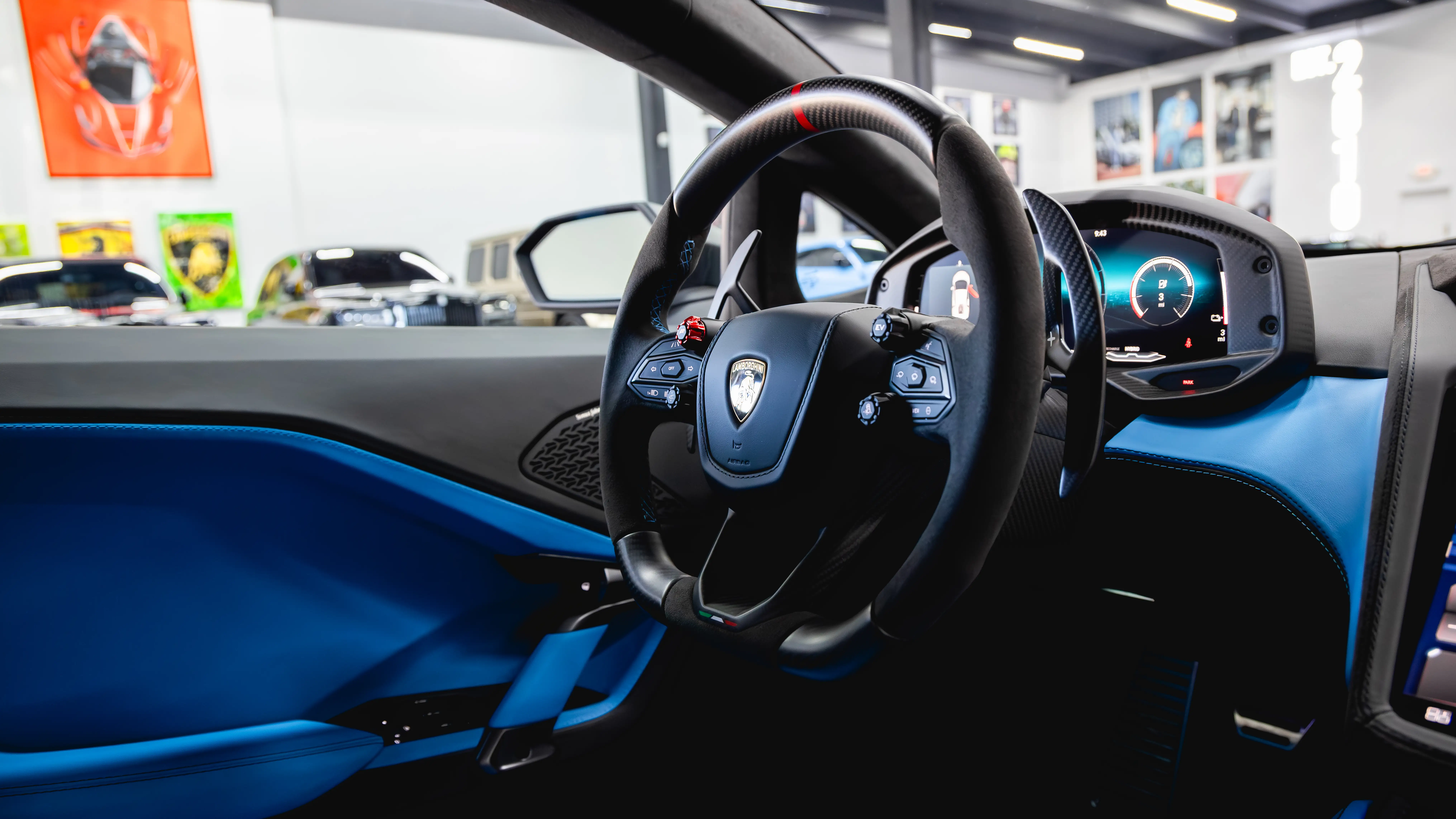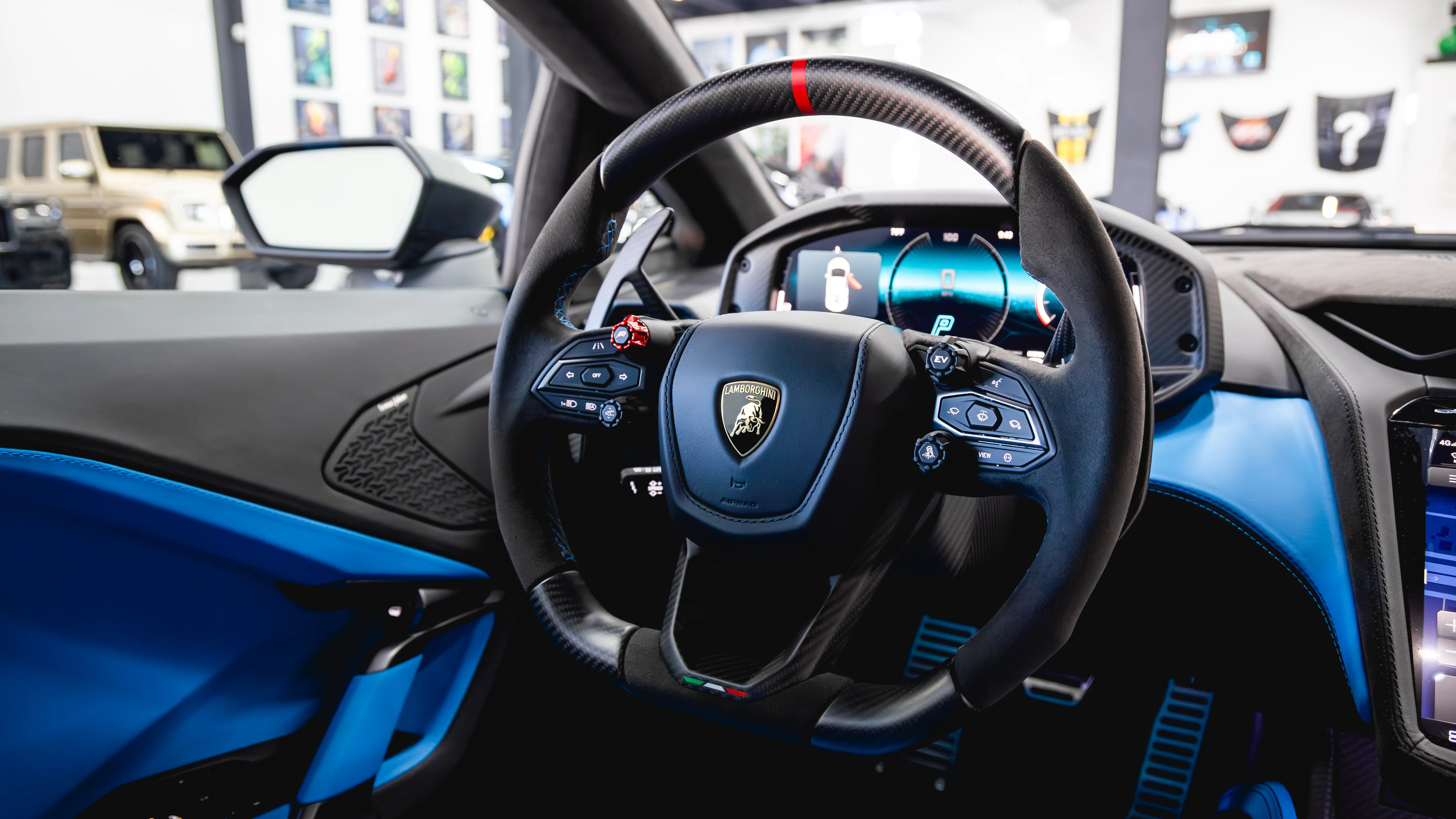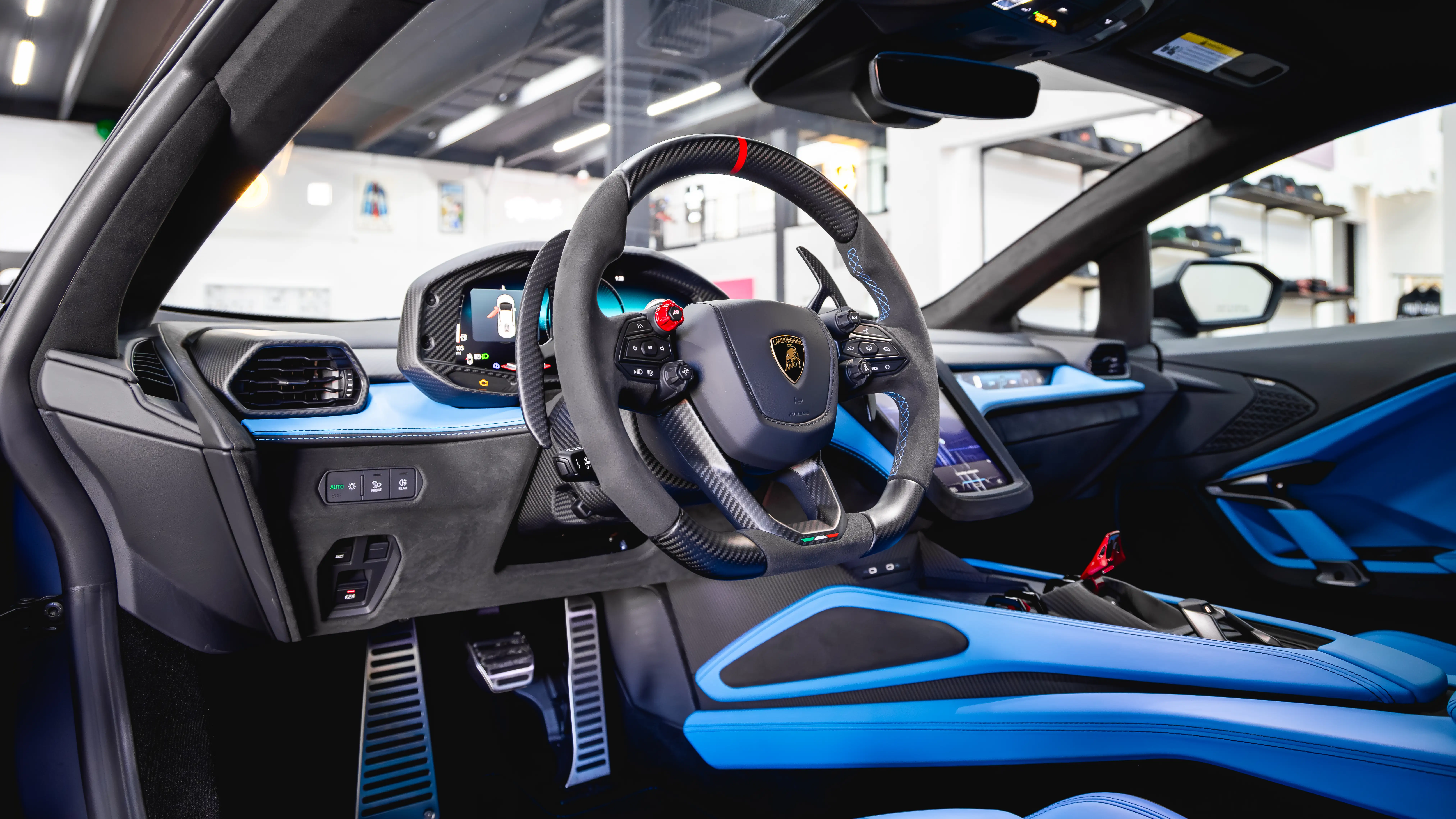 The materials are uncompromising: exposed carbon fiber trim, premium leather, and Alcantara dominate the touchpoints. However, the technology is what truly sets the cabin apart. Lamborghini has replaced standard analog layouts with a unified, cohesive digital architecture.