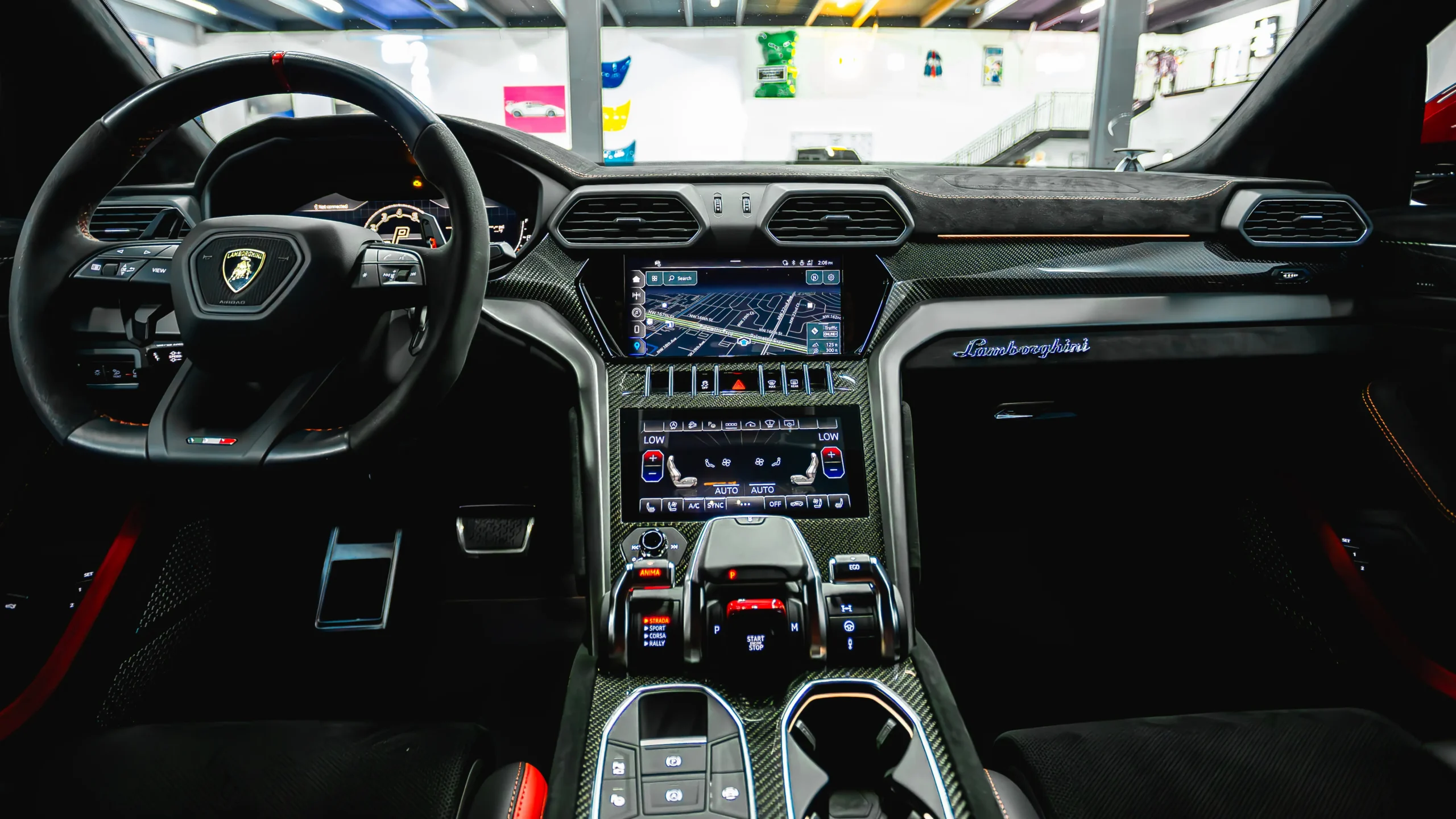 Stepping into the Urus, it is unequivocally a Lamborghini. Jet-fighter design cues are found throughout, from the start button hiding behind a red flip cover to the shifter resembling a jet throttle. Unlike traditional Lamborghinis, the Urus trends towards the comfort of a luxury SUV rather than the rawness of a race car. Five people can sit comfortably on the beautiful leather seats. A healthy-sized cargo area sits behind the rear seats, allowing you to actually load luggage into a Lamborghini.
