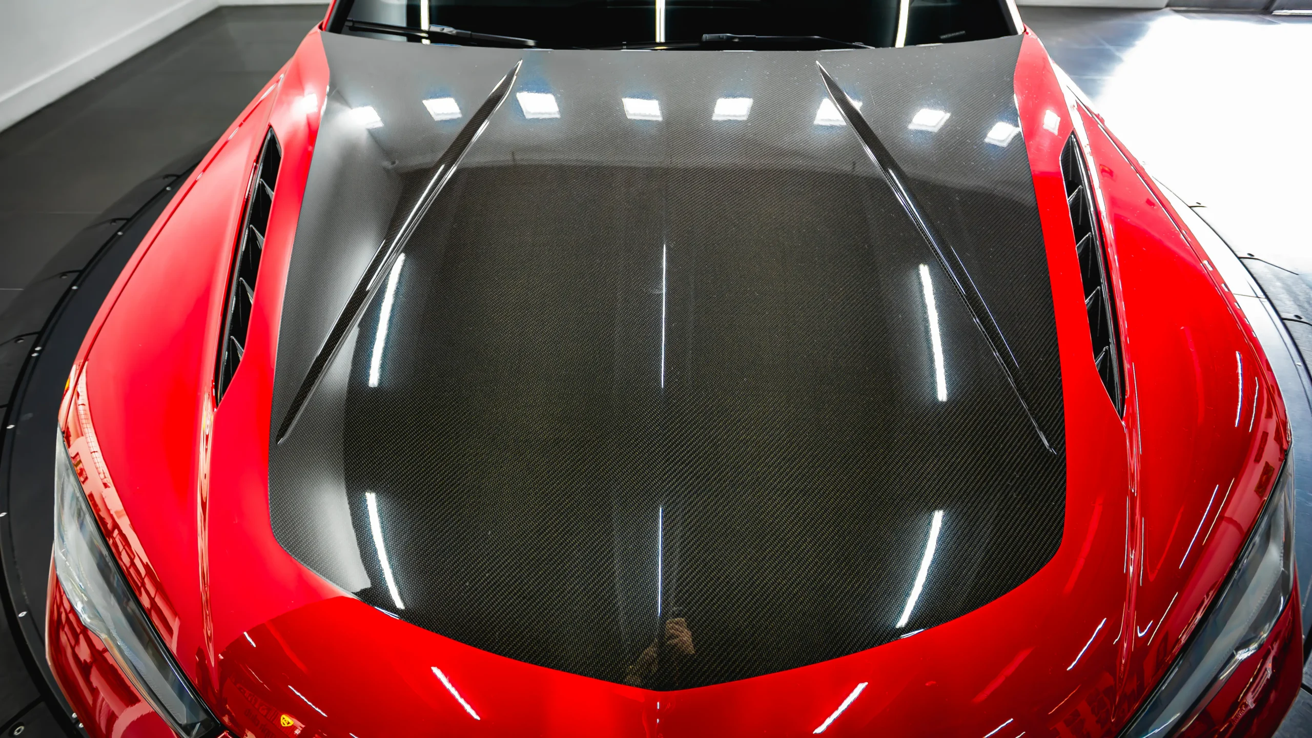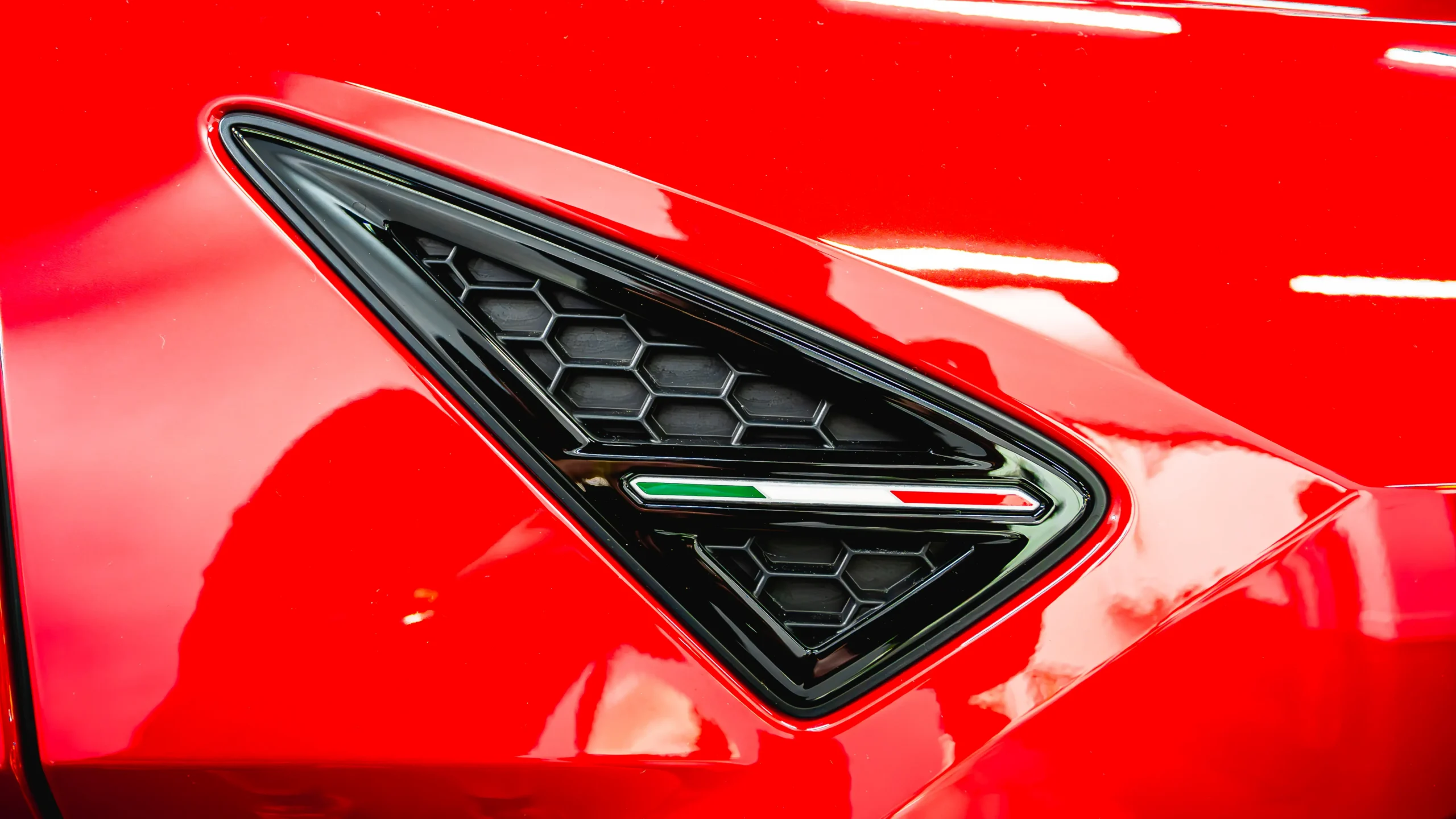 A vibrant red stitching wrapped sport steering wheel still gives the driver the feel of a performance vehicle. Sitting behind the steering wheel is a customizable digital gauge cluster that changes based on drive mode. To the right sits a flight control-inspired center console. A dual-screen setup occupies the space with a 10.1 inch top screen and an 8.6-inch bottom screen working in tandem. The system is compatible with Android Auto and Apple CarPlay and offers 3D map navigation and satellite radio.